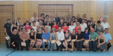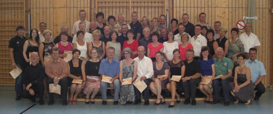 Zur Abnahme des Deutschen Tanzsportabzeichens fanden sich am strahlenden Frühsommer-Sonntag in Brennberg zu den 49 Prüflingen der Tanzsportabteilung des SSV Brennberg und der Tanzschule Retzer aus Wörth auch nette Zuschauer zum Anfeuern in der Turnhalle der Schule Brennberg ein. Nachdem alle Tänzer/Innen bestens durch ihre Trainer Doris und Hans Retzer vorbereitet worden waren, konnten sich 29 Teilnehmer/innen an die Abnahme durch Michael Prinzhorn, selbst Turniertänzer der S-Klasse in Standard und lizenzierter Wertungsrichter und Trainer des Deutschen Tanzsportverbandes bzw. des Landestanzsportverbandes Bayern wagen. Zwar waren alle Teilnehmer mit großer Nervosität behaftet, konnten aber durch überzeugende Leistungen erfolgreich ihre Tanzsportabzeichen ablegen. Nachdem sich Gäste und Prüflinge mit leckersten Kuchen und Kaffee gestärkt hatten, wurden nun alle Anstrengungen mit dem wohlverdienten Erfolg gekrönt!